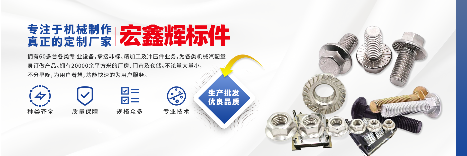 四川宏鑫輝標(biāo)準件制造有限公司下設(shè):南充市宏輝機械制造有限公司,南充市聚宏機電設(shè)備有限公司,公司始建于1994年。為了拓展市場,降低成本,本公司于2007年、2020年分別在南充、 成都、重慶創(chuàng)建了生產(chǎn)基地。擁有60多臺各類專 業(yè)設(shè)備,承接非標(biāo)、精加工及沖壓件業(yè)務(wù),為各 類機械汽配量身訂做產(chǎn)品。擁有20000余平方米的廠房、門市及倉儲。公司以誠信為本,竭誠為廣大客戶提供服務(wù)。不論量大量小,不分早晚,為用戶著想,均能快速的為用戶服務(wù)。 公司所生產(chǎn)及代理的產(chǎn)品為業(yè)界人士公認的國內(nèi)、國際優(yōu)等品牌。在產(chǎn)品性能與質(zhì)量
